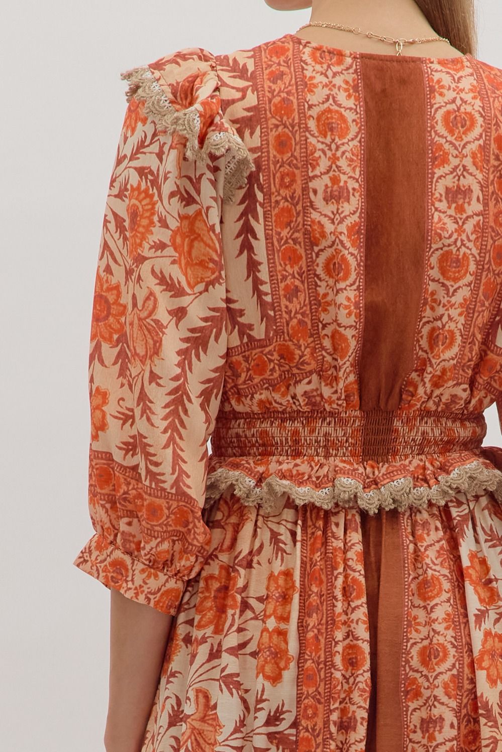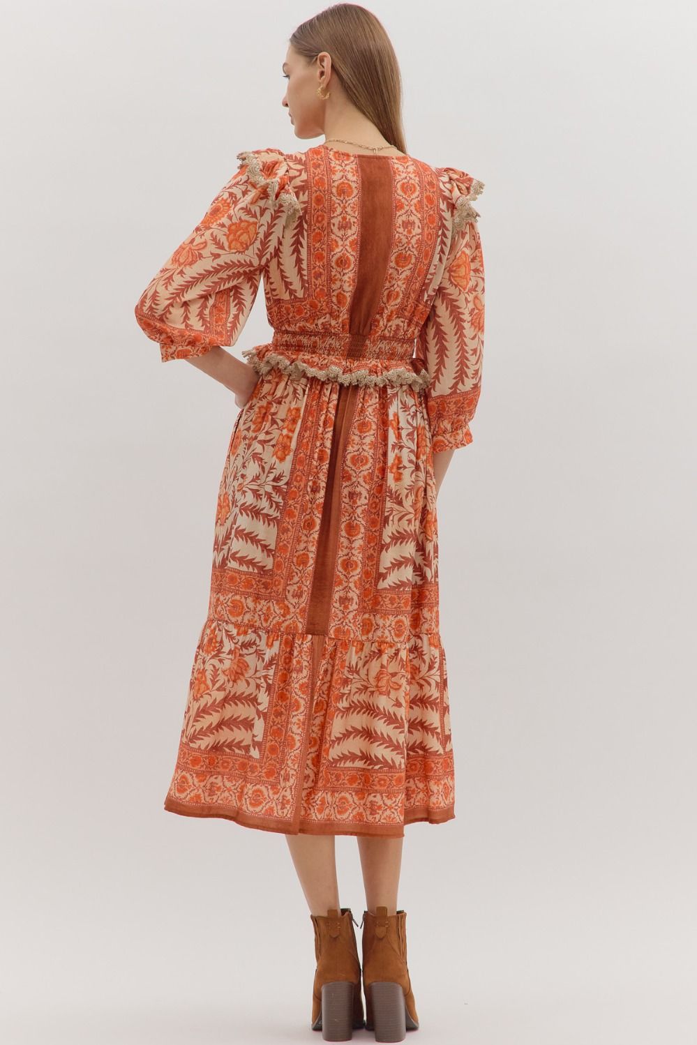 Bohemian- inspired midi dress featuring a warm orange floral print, ruffled details and flow- perfect for adding effortless charm to your everyday or getaway looks