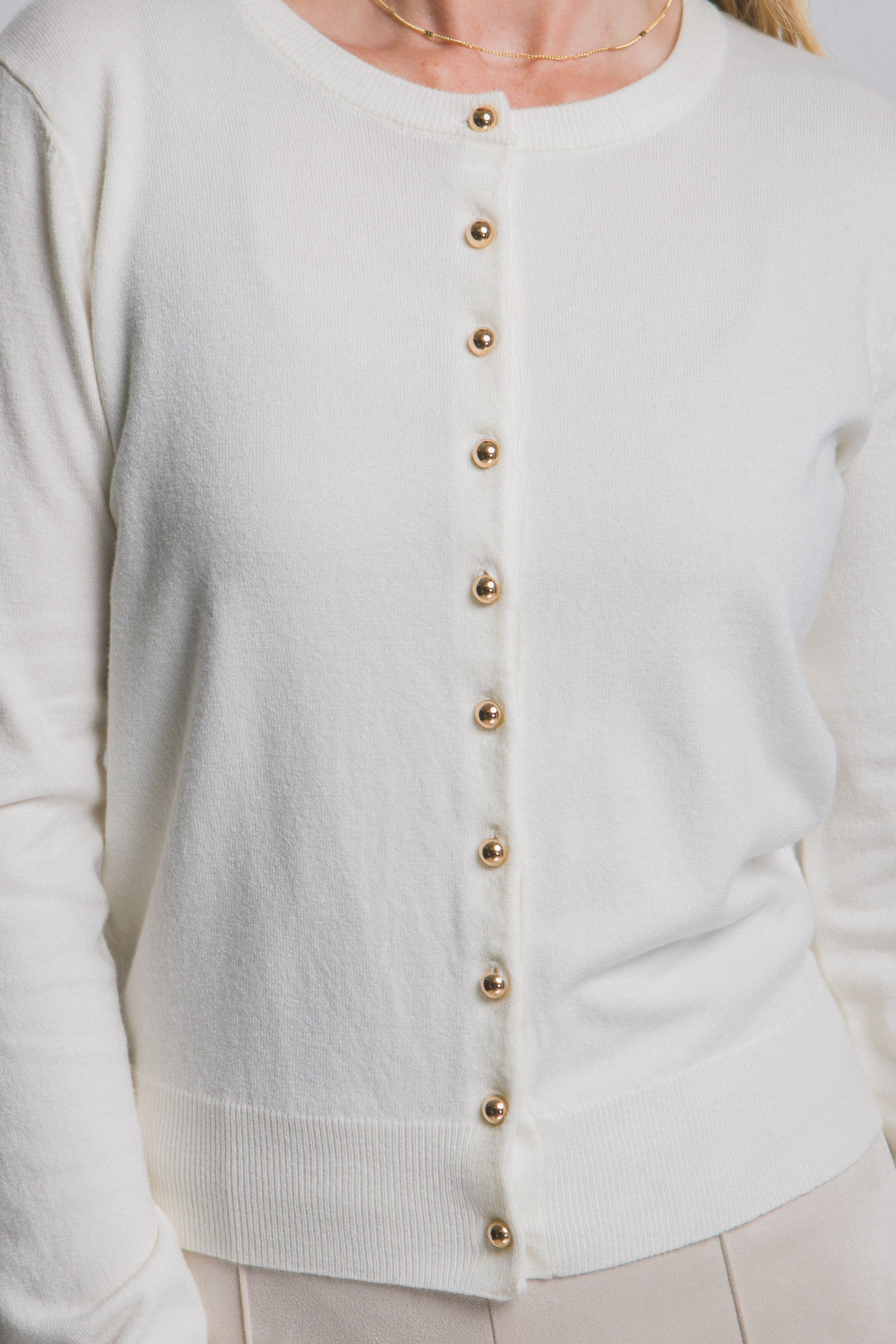 Elevate your wardrobe with the Goldilocks Cream Sweater Cardigan, featuring a timeless round neck and elegant golden button closures. Designed with long sleeves for added warmth and style, this cardigan seamlessly combines comfort with sophistication. Perfect for layering, it adds a touch of refined charm to any outfit while keeping you cozy throughout the day.